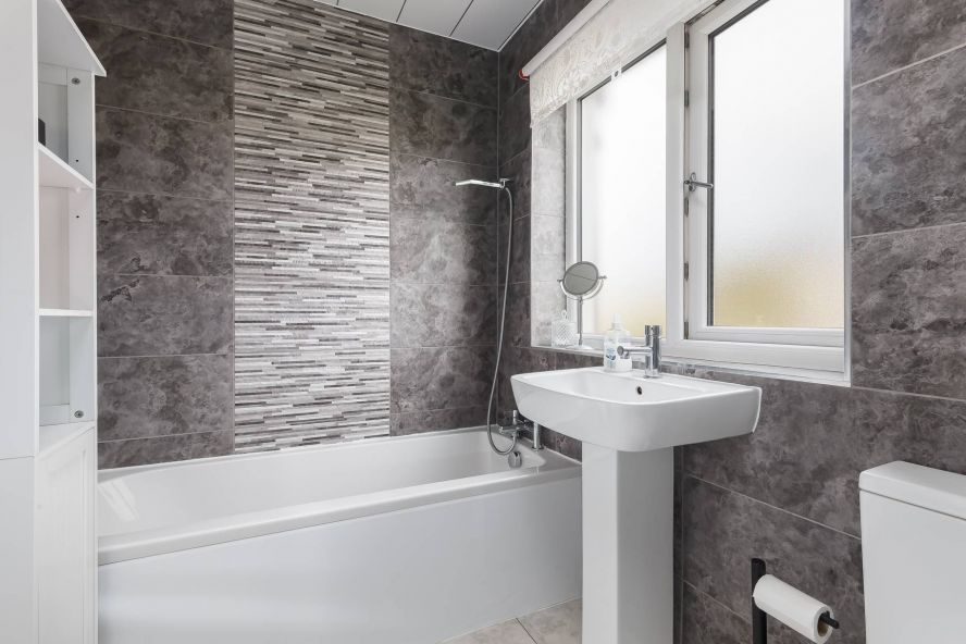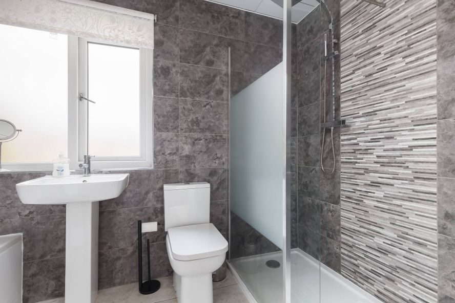 • Luxurious modern bathroom with fully tiled walls and flooring, pedestal wash basin, WC, bath and large walk-in shower enclosure