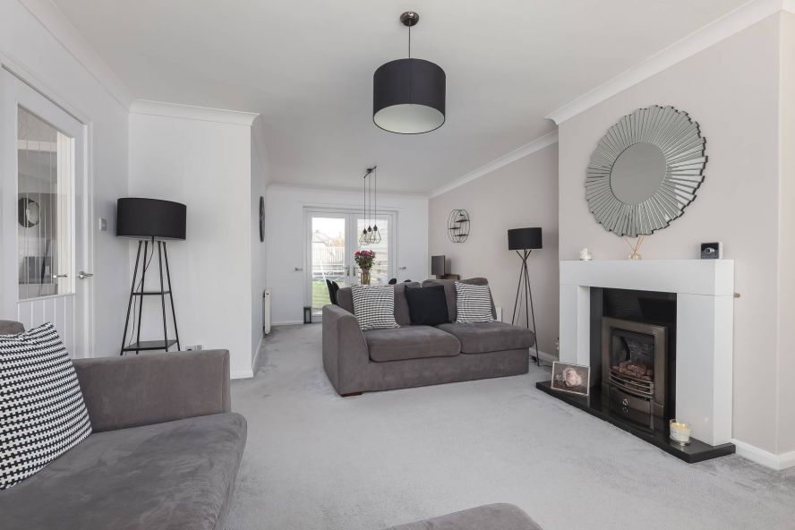 • Large sitting / dining room with cove cornicing, fitted carpet, living flame gas fire with marble hearth and modern surround, picture window to the front and French doors leading out to the rear garden