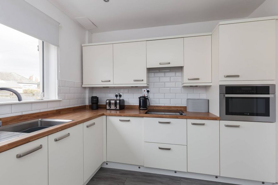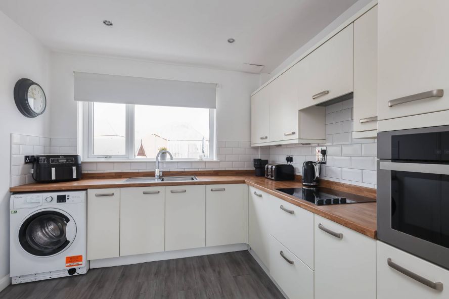 • Modern fitted kitchen with a range of cream wall and base mounted units with laminate oak style worktops and integrated appliances including electric ceramic hob with extractor hood, combination oven and dishwasher