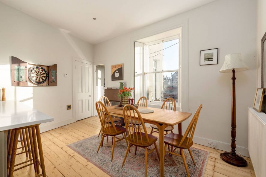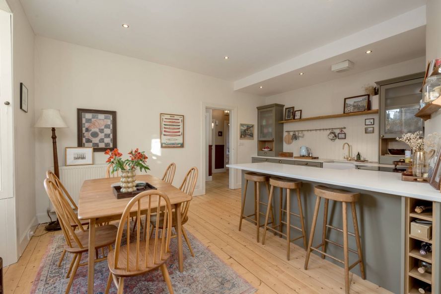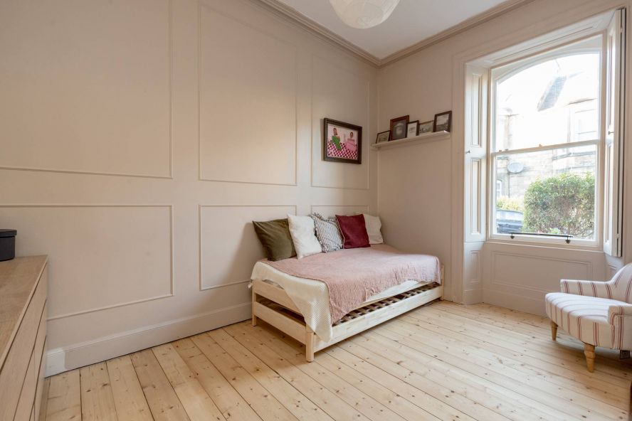 Beautifully presented, stone-built two-bedroom lower flat with a private entrance and gardens, located in the highly sought-after Leith Links area. This impressive and generously proportioned apartment has been finished to an exceptional standard, including a newly installed kitchen in 2024, and is offered to the market in genuine move-in condition. The original floorboards have been tastefully restored, complementing the abundance of period features that add charm and character throughout.