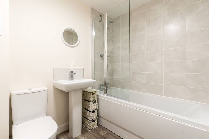 • Family bathroom with partially tiled walls, WC, pedestal wash basin and bath with shower over
