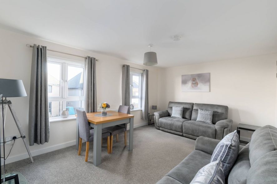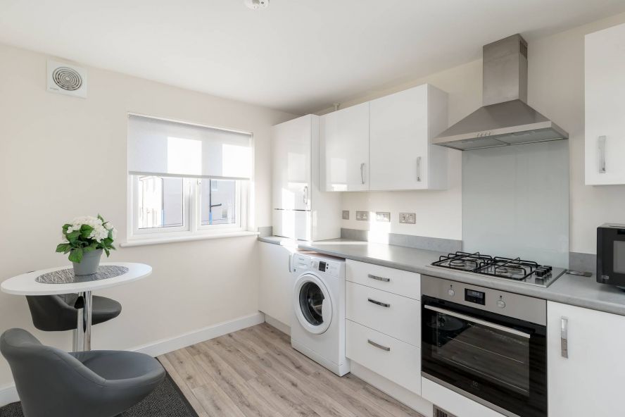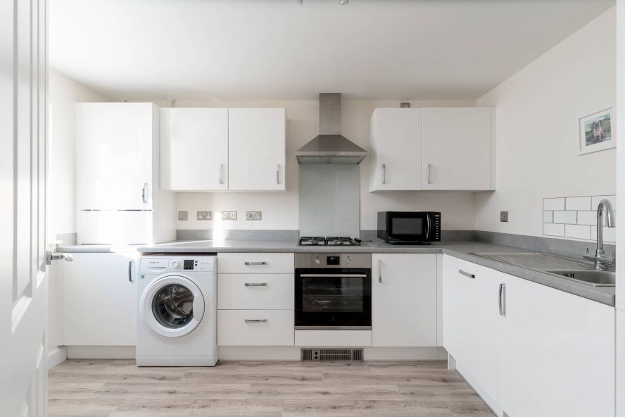 • Well-equipped fitted kitchen with a range of modern white units with grey laminate worktops with inset stainless steels sink and appliances including gas hob with extractor hood, oven, dishwasher, washing machine and fridge freezer