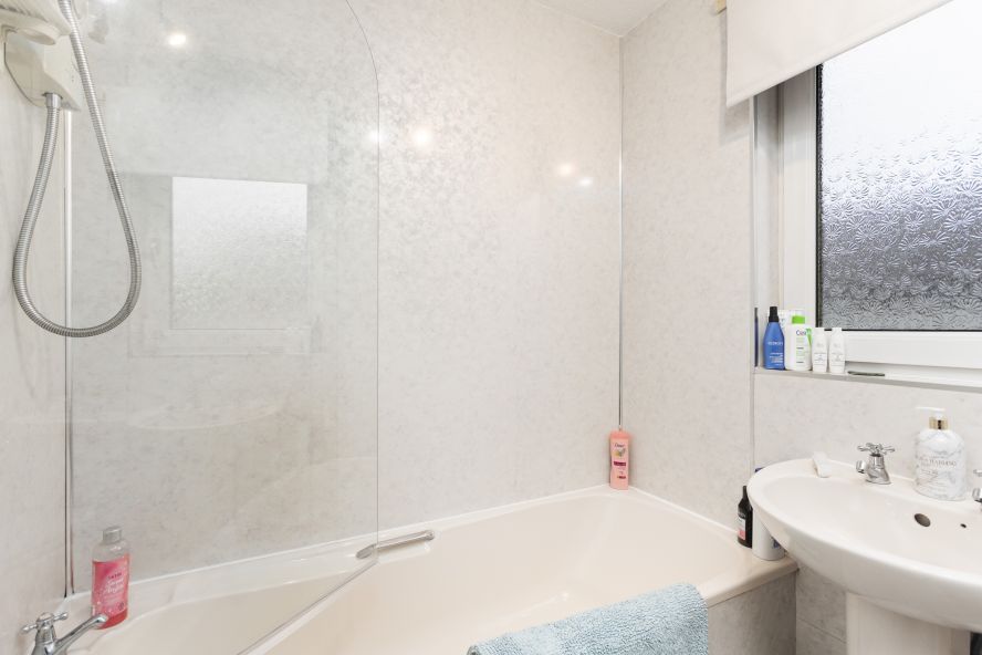 • Family bathroom comprising a WC, pedestal wash hand basin, heated towel rail, and bath with electric shower over