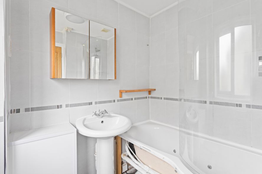 • Fully tiled bathroom comprising wash hand basin, WC, and bath with shower over