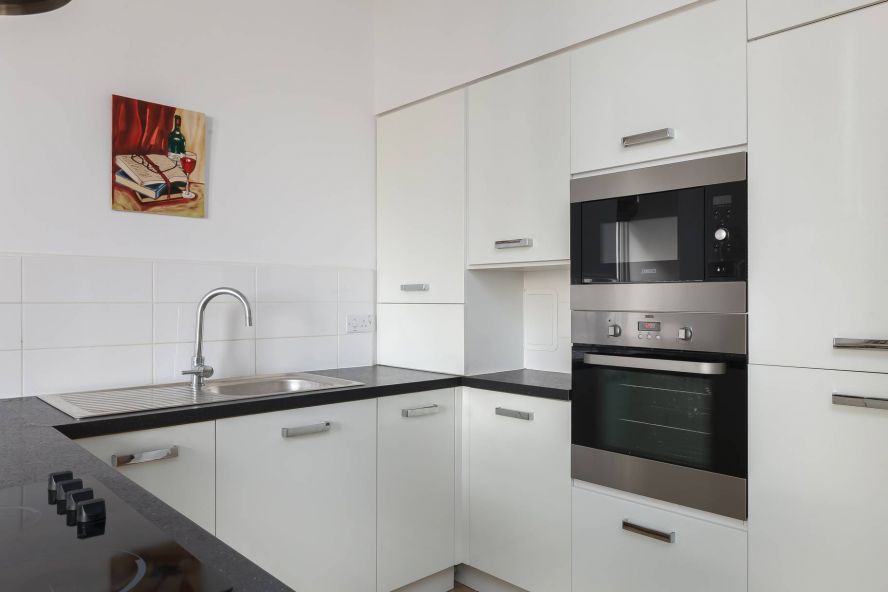 • Spacious open-plan living, dining and kitchen area, featuring a contemporary range of high-gloss white wall and base units with laminate worktops, and integrated appliances including an electric ceramic hob with extractor hood, electric oven, microwave, dishwasher, and fridge freezer; a separate utility cupboard houses the washer/dryer