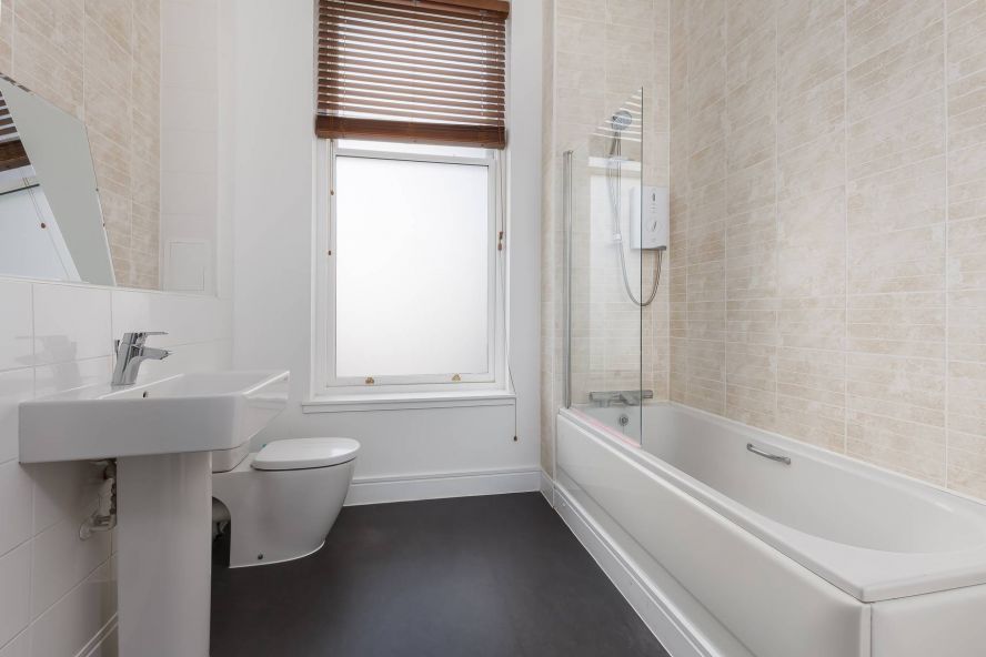 • Stylish modern bathroom fitted with a three-piece suite comprising pedestal wash hand basin, WC, and bath with electric shower over