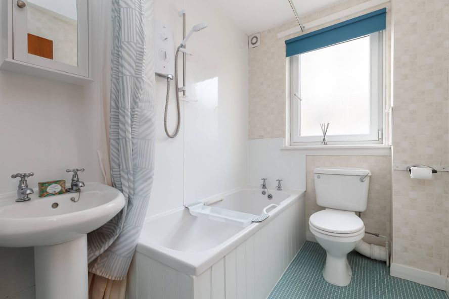 The bathroom is fitted with modern wall boarding and comprises a bath with electric shower over, WC, and wash hand basin, providing a clean and practical suite.