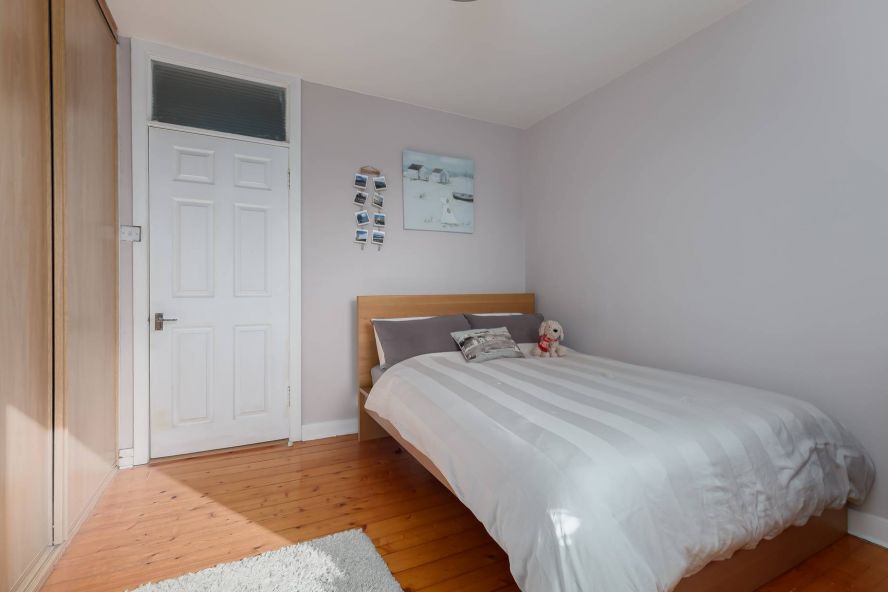 • A bright west-facing double bedroom with stripped wood flooring, built-in wardrobes, and additional storage cupboard