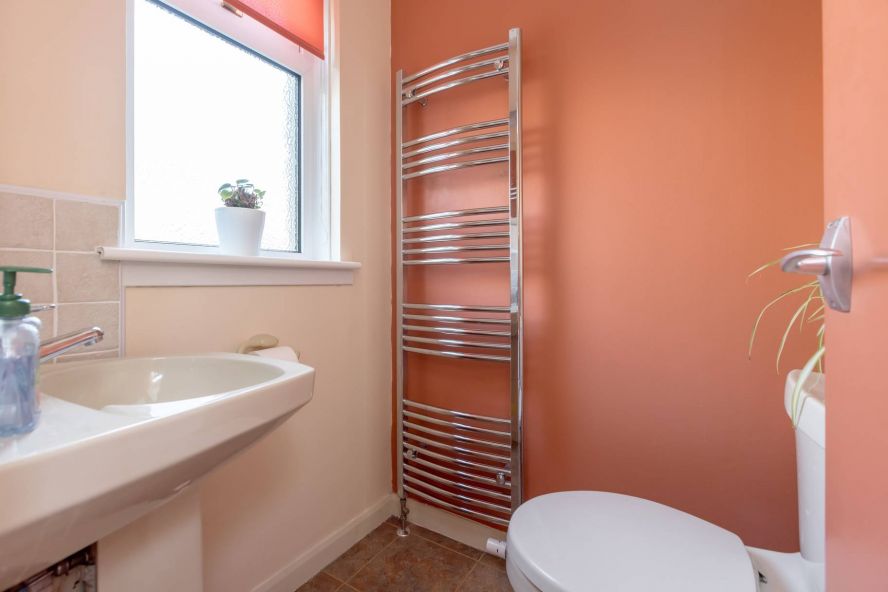 • A rear porch providing access to a contemporary ground floor WC, complete with wash hand basin and heated towel rail.