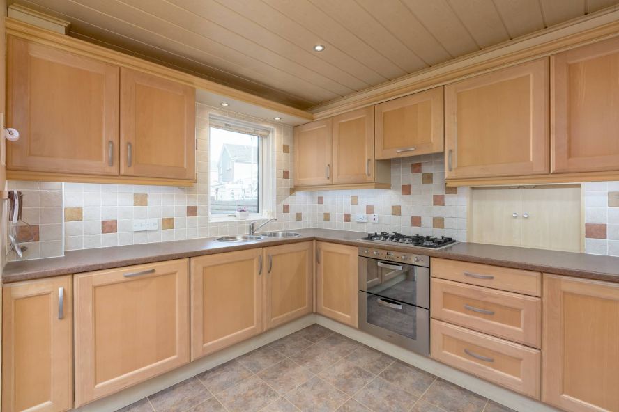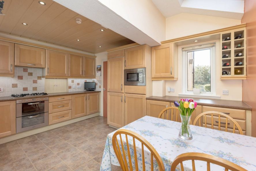• Well-appointed breakfasting kitchen, fitted with a stylish range of beech-effect units and coordinated worktops. These are complemented by integrated appliances including a gas hob with extractor hood, electric double oven, microwave, dishwasher, washing machine and fridge freezer.