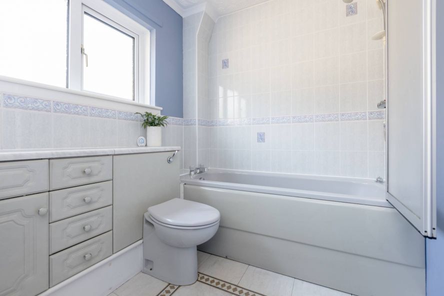 • Family bathroom featuring fitted furniture with inset wash basin, WC, and spa bath with mains pressure shower.