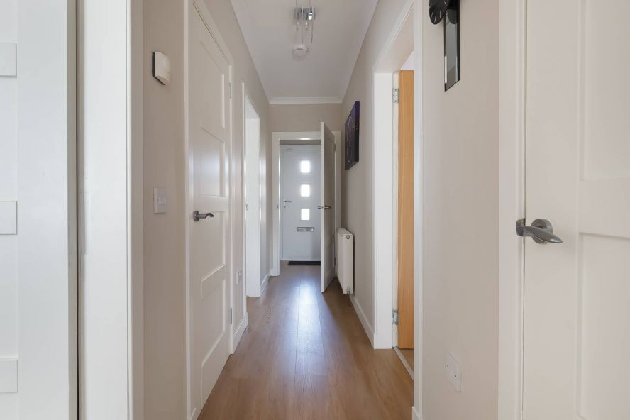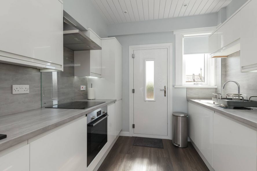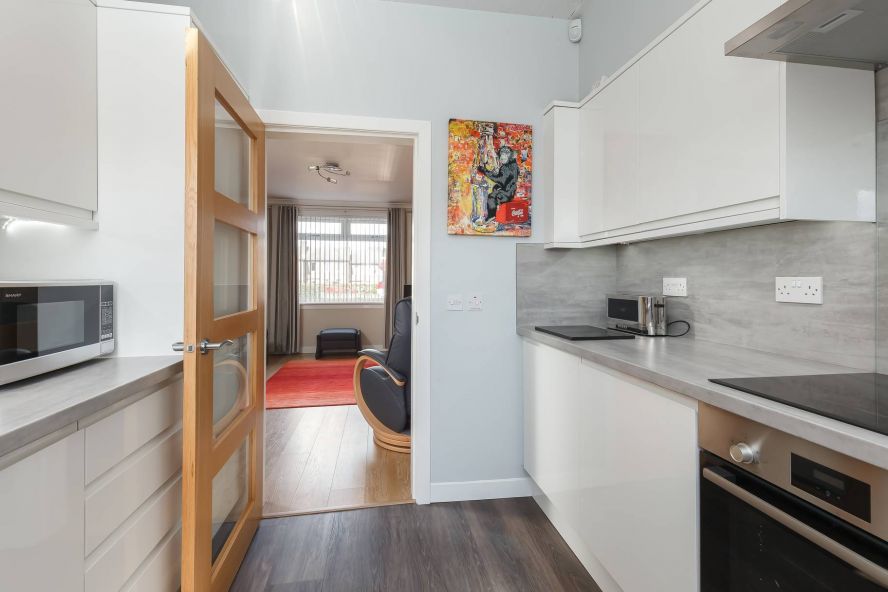 The accommodation is both stylish and well-proportioned, comprising an entrance vestibule housing the electrical board (the property was fully rewired in 2018), leading to a welcoming hallway with two deep storage cupboards. The contemporary kitchen is fitted with sleek, high-gloss handleless units, complemented by concrete-effect worktops and matching splashbacks, and is fully equipped with an induction hob, extractor hood, electric fan oven, fridge freezer and washing machine.