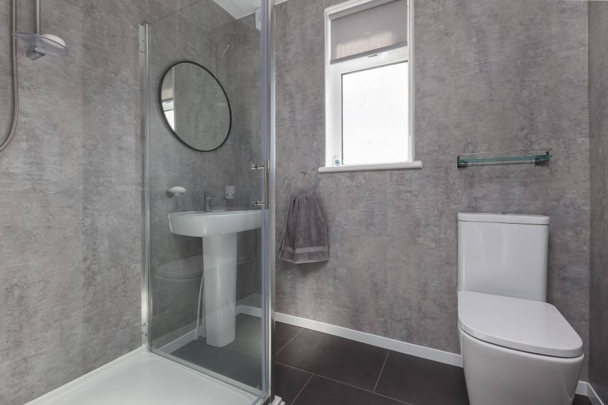 The generously sized living room offers a bright and comfortable setting, enhanced by oak-style flooring and elegant cornicing. There are two well-proportioned double bedrooms, including a front-facing principal bedroom and a second bedroom with useful built-in shelved storage. The shower room is finished in a modern style, featuring low-maintenance wall panelling, a spacious corner shower enclosure with electric shower, pedestal wash hand basin, WC, heated towel rail and luxury vinyl tile flooring.
