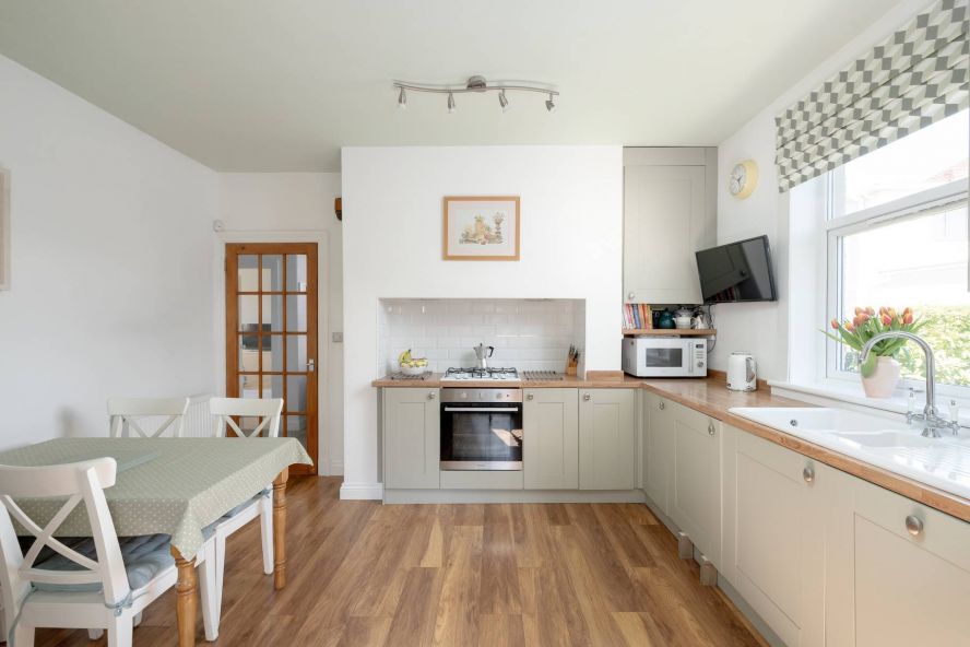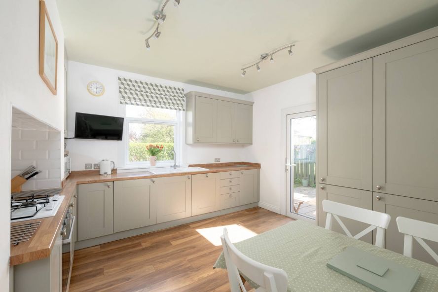 • Contemporary fitted kitchen with sage green shaker-style cabinetry, complemented by oak-effect worktops, a ceramic one-and-a-half bowl sink, gas hob, electric fan oven, dishwasher and fridge freezer