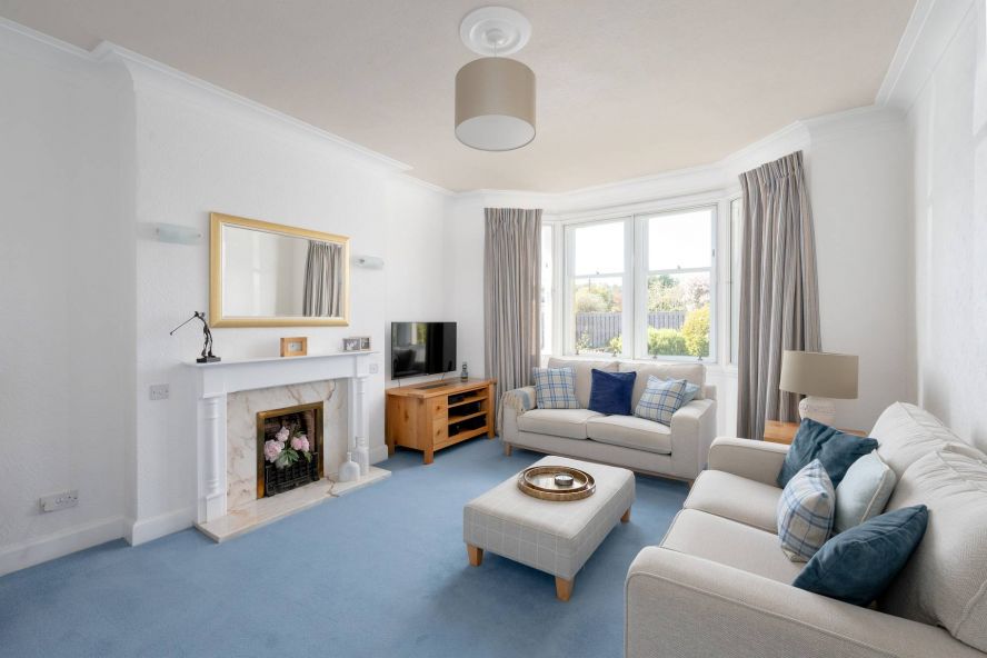 • Elegant bay-windowed sitting room, enhanced by ornate cornicing, a decorative ceiling rose, and a striking fireplace with marble hearth and timber surround